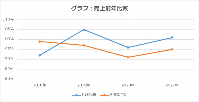 コロナ禍では働き方や生活様式の変容が進み、外出機会の減少に伴って、衣料品の肌着の売上げは縮小傾向が続いている。しかしながら、下記グラフによると、高齢者用・介護用肌着はそれほど影響を受けなかったことがわかる。あらためて、高齢者用・介護用肌着の重要性、必要性について再認識するに至った。