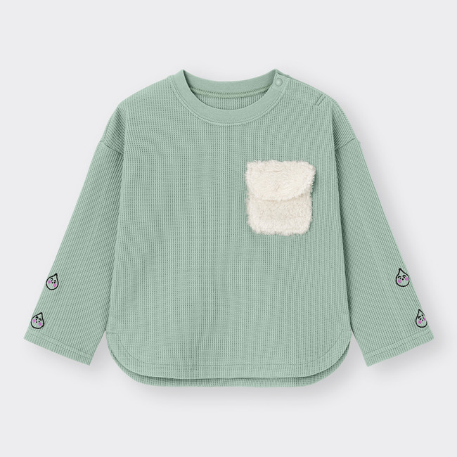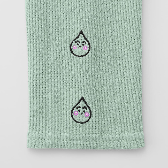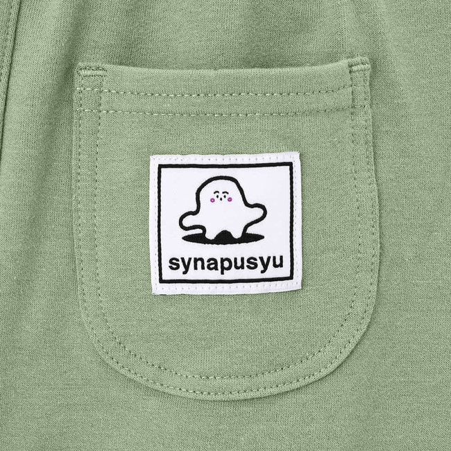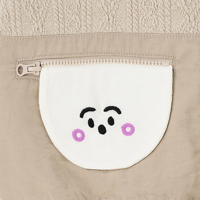 袖まくりが楽しくできるよう、そで先に「しずくのぷしゅぷしゅ」を目印としてあしらった。いないいないばぁ遊びができるよう、ふわふわの胸ポケットに「ぷしゅぷしゅ」を隠している。