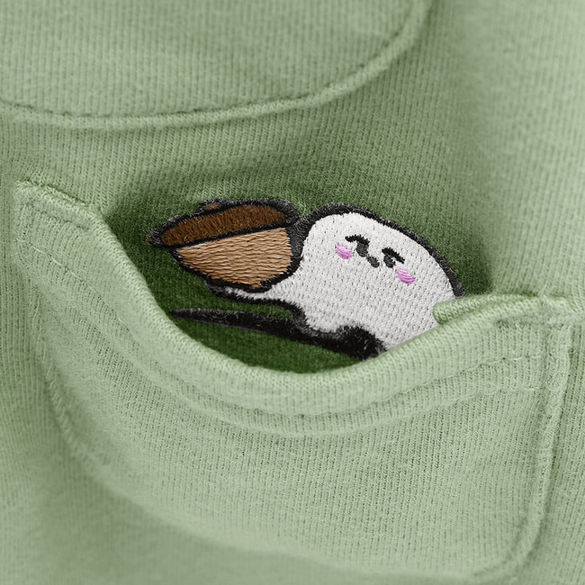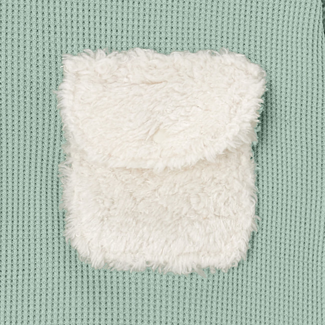 季節の外遊びで赤ちゃんたちが見つけた宝物をしまえるよう、小さなポケットにどんぐりのモチーフを刺繍した。寒い季節も安心してのびのび遊べるように「ぷしゅぷしゅ」の腹巻きをつけた。