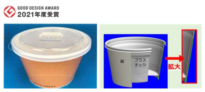 スープ容器の本体を一体化容器(プラスチック/紙)にするとともに、蓋の材質・材厚を変更することにより、石油系プラスチックを従来品に比べ1食当たり約15%削減できる。年間約では39tの削減が見込まれるという。
