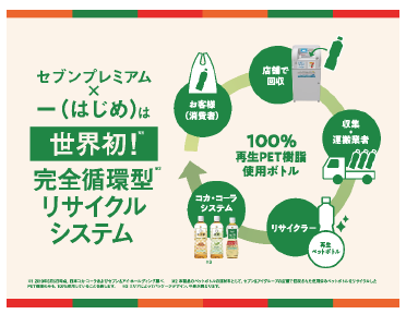 「完全循環型ペットボトルリサイクル」とは、セブン&アイグループ店頭でペットボトルを回収し、そのペットボトルだけを原材料として再生PET樹脂をつくる手法だ。そして、その再生PET樹脂をでつくったペットボトルを使用した商品を、再び同グループ店舗で販売するという世界初(2019 年6月5日時点)のリサイクルシステム。