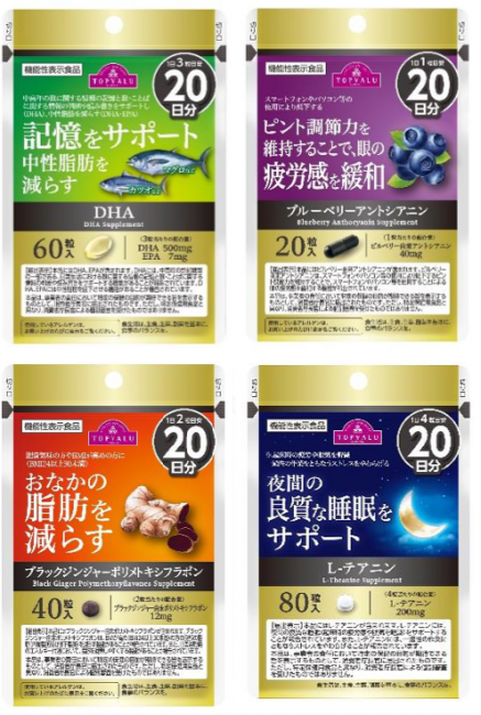 記憶をサポートし、中性脂肪を減らす「トップバリュ DHA 20日分」は60粒入りで1944円(税込)。ピント調節力を維持することで、眼の疲労感を緩和する「トップバリュ ブルーベリーアントシアニン 20日分」は20粒入りで1296円。おなかの脂肪を減らす「トップバリュ ブラックジンジャーポリメトキシフラボン 20日分」は40粒入りで1814円。夜間の良質な睡眠をサポートする「トップバリュ L-テアニン 20日分」は80粒入りで1814円。