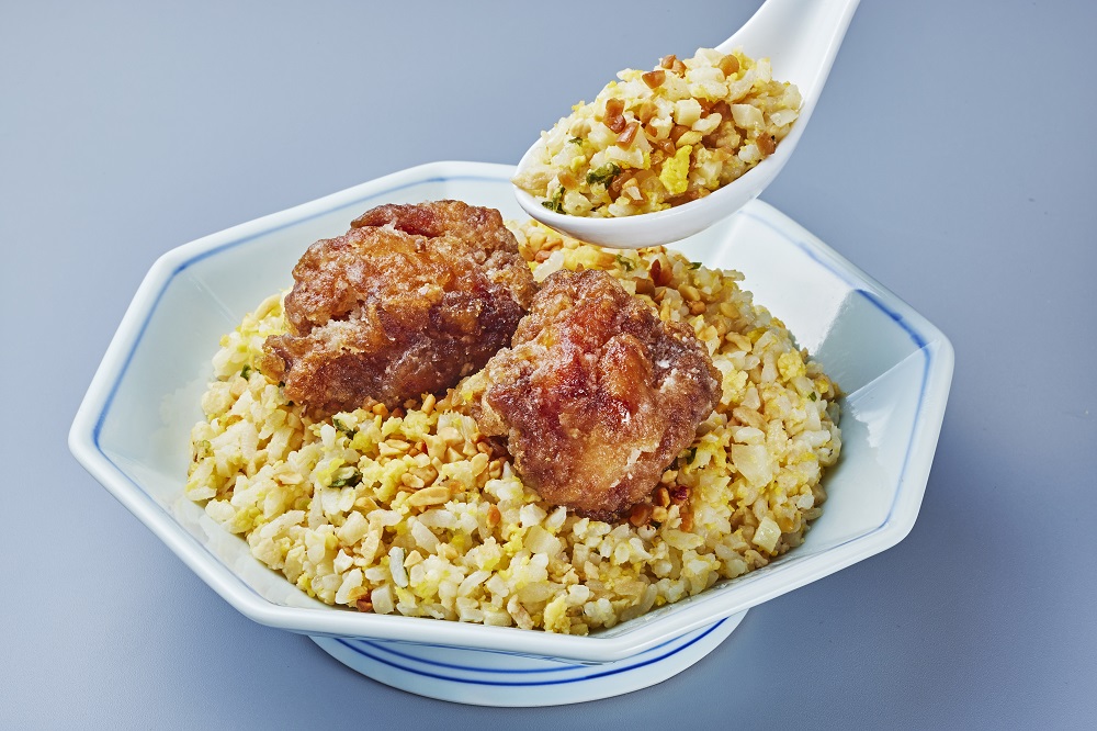 大豆たんぱくを混ぜたご飯を玉子、筍、刻んだカリフラワーと炒め合わせ、ボリュームを出しつつ糖質をカットした。竜田揚げを2個のせており、たんぱく質も摂れる。1包装当たり糖質53.2g(59%オフ炒飯)、たんぱく質30.7g。