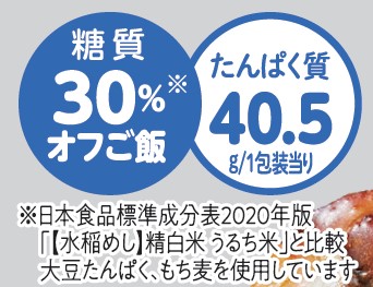 「裏切りの一杯」の新シリーズでは、ご飯に大豆たんぱくを混ぜることで糖質をカットし、さらにたんぱく質も摂取できる。「裏切りの一杯 ごろっとチキンのチーズカレー」「裏切りの一杯 炒飯&竜田揚げ丼」は、「裏切りの一杯」シリーズとして、たんぱく質が摂れる初めての弁当だ。パッケージに糖質オフ率(糖質低減率)やたんぱく質量などを分かりやすく表示し、より選びやすい仕様にした。