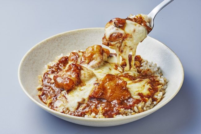スパイシーなカレーに、にんにくや醤油に漬け込んで焼いたチキンとチーズをトッピングした。大豆たんぱくを混ぜたご飯で糖質オフしながらたんぱく質が摂れる。1包装当たり糖質52.6g(30%オフご飯)、たんぱく質40.5g。