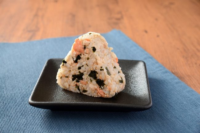 昆布だしで炊いたご飯に紅鮭、わかめ、胡麻を合わせておにぎりにした。ご飯に大豆たんぱくを混ぜて糖質を抑えた。1包装当たり糖質23.7g(42%オフ)。