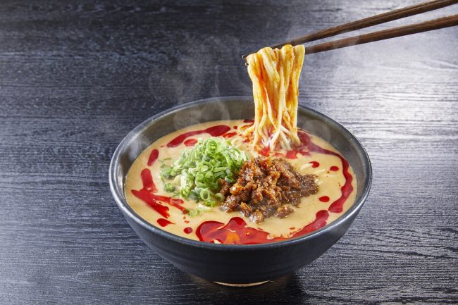 北海道産小麦を使った糖質オフ麺に、鶏と豚のWスープとたっぷりの練り胡麻を合わせコク深く仕上げた。赤ラー油がピリッときいている。1包装当たり糖質30.3g(40%オフ麺)。
