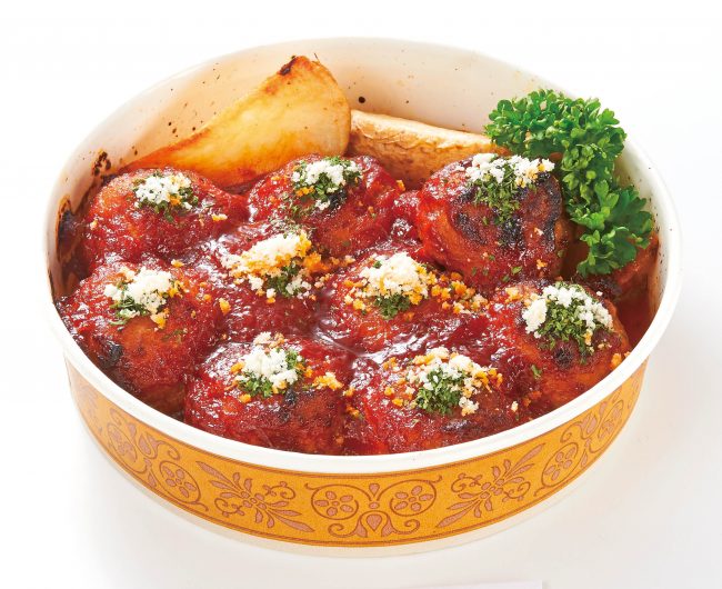 三つ目は「完熟トマトソースのやわらかミートボール(ポテト入)」。食感をやわらかくして、子どもからお年寄りまで食べやすくした。ソースは完熟トマトの旨味と酸味のバランスの良いソースを使用。 ひき肉をこねる回数や加熱時間など、 何度も試作を繰り返しやわらかい食感に仕上げている。1パックにミートボール9個とポテトが入っていて家族で楽しめる商品になっている。1パック498円。