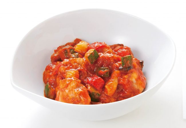 二つ目は「鶏もも肉とトマトソースの旨味を楽しむカチャトーラ」。カットした国内産若どりもも肉に4種の野菜(ズッキーニ、赤パプリカ、黄パプリカ、なす)を加えて加熱し、 イタリア産トマトを使用したこだわりのトマトソースを絡めた商品。100グラムあたり198円。