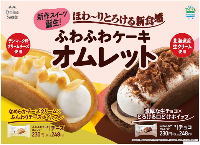 流通スーパーニュース > 新商品 > ファミマnews|新食感スイーツ「ファミマのオムレット」11/23発売 ファミマnews|新食感スイーツ「ファミマのオムレット」11/23発売 新商品 / 2021年11月24日 ツイート (株)ファミリーマート(東京都港区、細見研介社長)は11月23日(火)、新食感スイーツ「ふわふわケーキオムレット チーズ」「ふわふわケーキオムレット チョコ」を全国のファミリーマート約1万6600店で発売した。 ケーキを手軽に楽しめるようにワンハンドスイーツとして開発した。卵白や米粉を使用したふわふわ食感の生地で、こだわりのふんわりホイップを包んでいる。税込248円。 ツイート