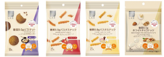 冬季限定商品は、ビスケット黒糖きなこ味213円(税込み、以下同じ)、パスタスナック アラビアータ味とカルボナーラ味162円。新たな定番商品にホワイトチョコナッツ213円。糖質を抑えながらも、不足しがちな食物繊維などを摂取できるポケットサイズスナック。