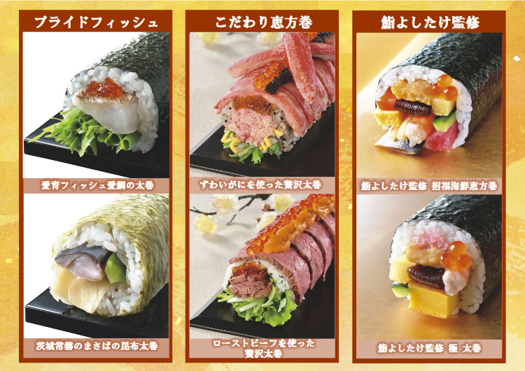 前年好評だった「プライドフィッシュ」を使用した恵方巻は、「愛育フィッシュ 愛鯛」 と「茨城常磐のまさば」を使用した太巻2品目を新たに加えて6品目の展開になる。プライドフィッシュとは、全国漁業協同組合連合会が都道府県ごとに選定した、地元漁師が自信をもって勧める水産物のこと。「プライドフィッシュ巻6種セット」は2360円、「プライドフィッシュが味わえる太巻」は各種1580円。