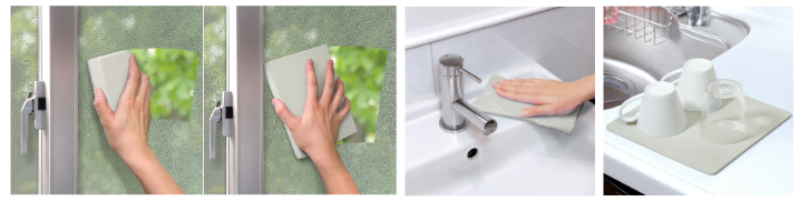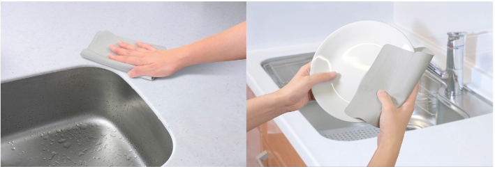 超吸水キッチンクロスは、洗った後の食器や鍋の拭き上げ、水切り・シンクまわりの水ハネなど、キッチン廻りの水滴を素早く拭き取とることができる。PVAスポンジのため、拭き残しが少なく二度拭きいらずで、また繊維素材ではないので毛羽落ちもない