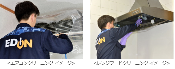 エアコンクリーニングでは運転能力を点検し、室内機の汚れを除去し、エアコンの冷暖房能力を回復する。レンジフードクリーニングではシロッコファン、フード部、ドラム部を徹底洗浄し、レンジフードの運転能力を回復する。