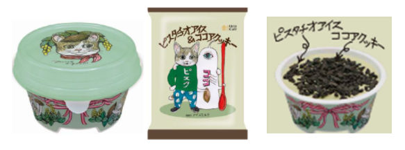 「Uchi Café ピスタチオアイス&ココアクッキー」は税込298円。ピスタチオのアイスにほろ苦く塩気のきいたココアクッキーをトッピング。カップにはヒグチさんのイラストがくるりと360度描かれている。