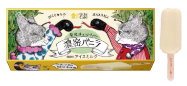 「Uchi Café贅沢チョコレートバー濃密バニラ」は税込215円で、マダガスカル産バニラビーンズシード配合のアイスをフランス産ホワイトチョコレートでコーティングしている。パッケージには人気キャラクターの「ギュスターヴくん」描かれ、スティックの絵柄は4種類を用意する。すべて描き下ろしのデザインとなる。