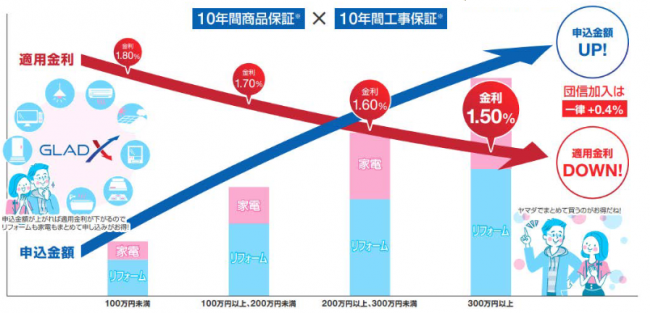 1つ目は「グラッドクロス」。リフォームにおける定額制およびクレジット金額に応じた低金利制等のクレジットプランで、リフォームと家電をあわせて、申し込んだ場合、金額が上がるほど金利が下がるという、かつてないクレジットのプラン。住宅事業と環境事業、どちらも手掛けるヤマダホールディングスだからこそ実現した独自の新サービスだという。