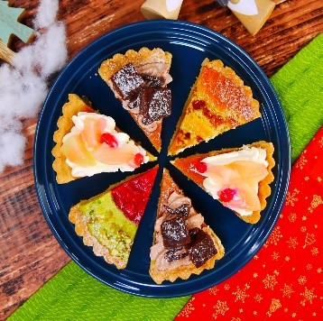クリスマスパーティーにオススメのタルトセット。ピスタチオ苺、チョコ、白桃、キャラメル洋梨の4種類のタルトを組み合わせた。切り分け済みなので、ナイフで切る手間が省ける。価格は980円。
