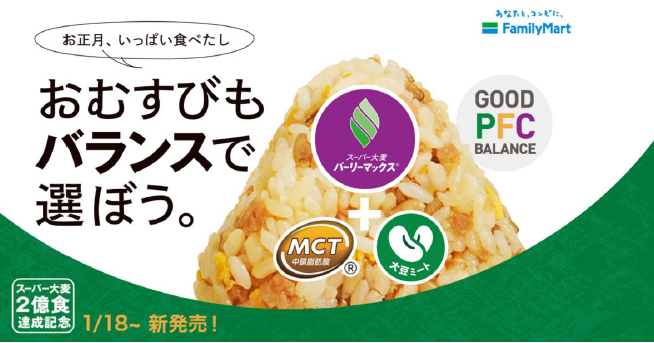 このスーパー大麦「バーリーマックス®」に加え、健康意識が高い人の間で話題のMCTオイル、高たんぱく食品である大豆ミートが入ったおむすび2品を 1月18日(火)から、北海道を除く全国のファミリーマート約 1万6400店で販売する。同時に、スーパー大麦を使用した商品を地域限定で5品販売する。