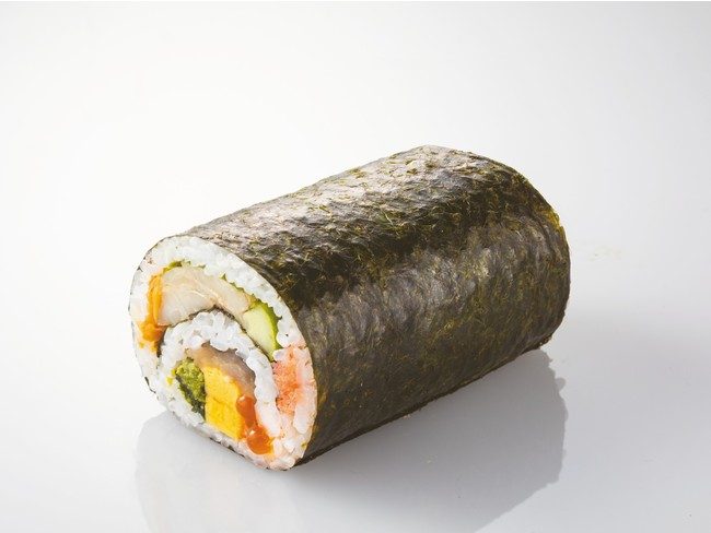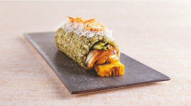 静岡の豊かな自然が育んだ山海の恵みを1本に巻いた。静岡県浜名湖産うなぎ蒲焼を主役に、静岡産わさび漬物(醤油漬け)、静岡産釜揚げ桜えび、静岡産釜揚げしらす、天空の抹茶を添えた。