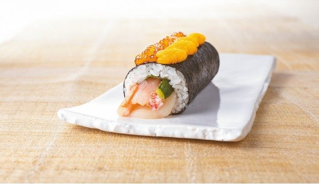 誰もが一度は食べてみたい海鮮王国の味が楽しめる。北海道産紅ずわいがに、北海道産ほたて、キュウリを一緒に巻いた。北海道産いくら、北海道産うには別添えにした。