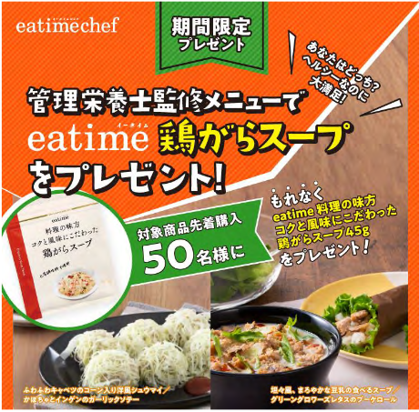 新商品の販売を記念して、「担々風、まろやかな豆乳の食べるスープ/グリーングロワーズレタスのブーケロール」か「ふわふわキャベツのコーン入り洋風シュウマイ/かぼちゃとインゲンのガーリックソテー」を購入した人を対象に先着50個限定で「eatime 鶏がらスープ」プレゼントキャンペーンを実施している。