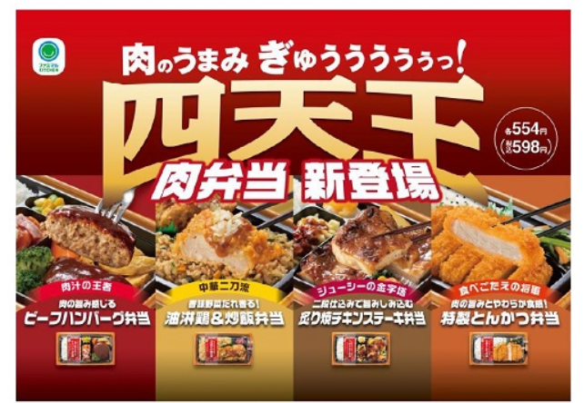 「肉弁当 四天王」は、「肉の旨み感じる ビーフハンバーグ弁当」、「香味野菜だれ香る!油淋鶏&炒飯弁当」、「二段仕込みで旨みしみ込む 炙り焼チキンステーキ弁当」、「肉の旨みとやわらか食感!特製とんかつ弁当」の4種類だ。