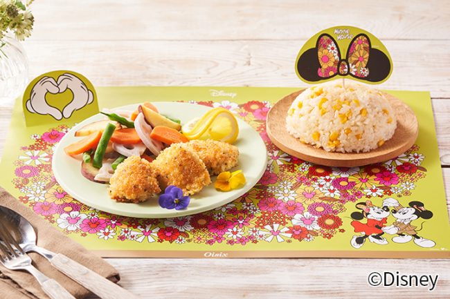 2月24日(木)から販売を開始するコース第1弾商品は「<ミッキー&ミニー>チキン香草焼き」。主菜がチキン香草パン粉焼きで、副菜はバターコーンピラフ。ランチョンマットいっぱいに花が広がり、皿の上にはエディブルフラワーを飾り付けるなど春の訪れが感じられる一品。エディブルフラワーの色や種類はランダムとなっている。