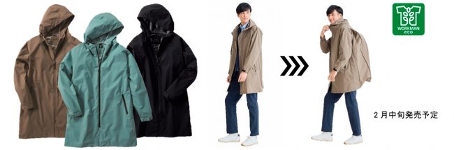 帝人と共同開発したSOLOTEX®素材を使用した初めてのレインコート。耐水圧1万mmと透湿度1万g/㎡/24hの本格的防水/透湿機能を搭載している。両脇のファスナーを開けてBAG INにする。BAG INの機能はビジネスにも使えるコートとしては日本初となる。色はブラウン、ブラック、ダスティブルーの3色で、サイズはS~3L。