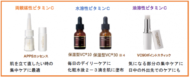 既存品のビタミンCは水溶性や油溶性が主流だったが、APPSは水・油のどちらともなじみやすい両親媒性のビタミンC誘導体である。そのため、角層まで行き届き、毛穴の広がりやざらつき、ハリ・弾力のなさなど、幅広い肌悩みに集中的にアプローチする。