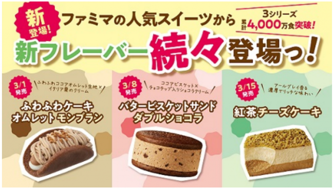 (株)ファミリーマート(東京都港区、細見研介社長)は、3シリーズ累計4000万食を販売した人気のスイーツシリーズの新フレーバーを3月1日(火)から順次、全国のファミリーマート約1万6600店で販売する。