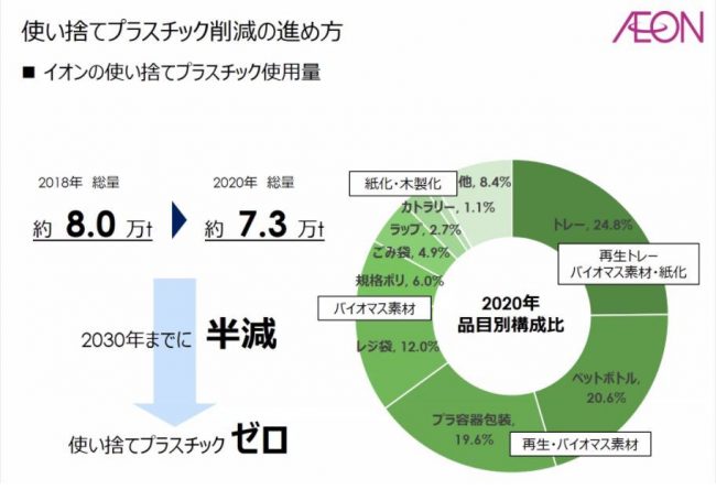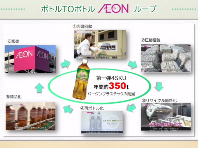 同社は資源循環型社会の実現に向け、使い捨てプラスチックの使用量を2030年までに半減する目標を掲げている。その一環として、トップバリュの全商品で環境・社会に配慮した素材を使用するとともに、ペットボトル飲料で使用するペットボトルは、100%再生または植物由来の素材へと転換を進めている。