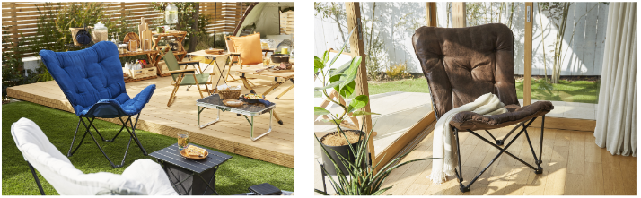 新モデルのバタフライチェア(税込価格4990円、以下同)はネイビー、ベージュ、グレー3色で、座面を洗濯機で洗える仕様に変えた。またハイバックタイプ(7990円、ブラウン、グリーン2色)は頭をしっかり支えられるように通常サイズより背もたれを高い仕様にした。座面も広くクッション量も1.5倍にすることでより⻑時間くつろいで使用できる。