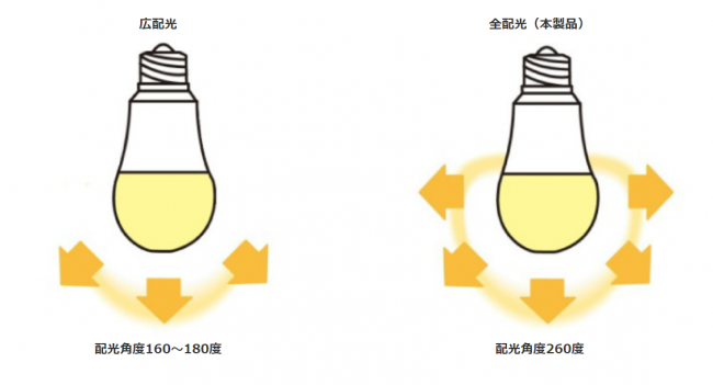 配光角度が広く、寿命は約40,000時間。安価なLED電球は配光角度が狭いものが多いなか、配光角度が260度と広範囲のため、明るさを実感できる。また、浴室灯や玄関の照明など、密閉型の照明器具にも対応している。