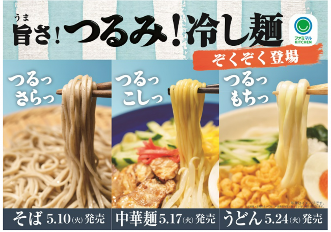 5月10日(火)から「そば」、5月17日(火)から「中華麺」、5月24日(火)から「うどん」を、全国のファミリーマート約1万6600店で順次発売する。