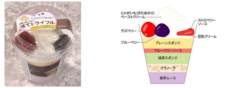 ピンク、緑、黄色で春らしい色合いに仕上げた6層仕立ての春らしいスイーツ。さまざまな栄養素を含むグラノーラを約10g使用しているほか、スイーツには珍しいじゃがいも(きたあかり)を使用している。