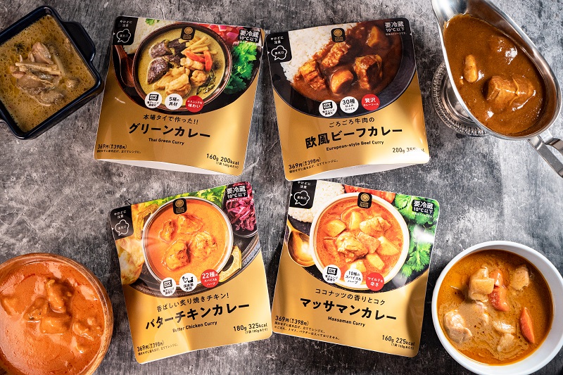 発売するのは、炙り焼きチキンが入った「香ばしい炙り焼きチキン!バターチキンカレー」、タイの工場つくった「本場タイで作った!!グリーンカレー」、「ごろごろ牛肉の欧風ビーフカレー」、「ココナッツの香りとコク マッサマンカレー」の4種類。いずれも本体価格369円。
