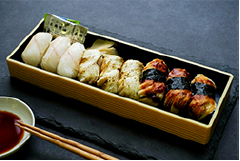 穴子煮・炙り穴子・穴子刺身の3種を盛り合わせた黄金あなごの握り寿司。黄金あなごは脂が甘く旨味もあり、身が柔らかい。穴子煮、炙り穴子、穴子刺身の異なる味わいが楽しめる。