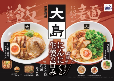 ミニストップ(株)(千葉市美浜区、藤本明裕社長)は、東京都江戸川区船堀のラーメン専門店「大島」店主、大島剛史氏が監修し2022年1月に発売した味噌ラーメンに続く第2弾として、麺類3品と、ご飯類3品、合計6品を5月24日(火)から国内のミニストップ店舗で発売する。