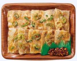 にんにく・生姜・ねぎの効いた濃いめの味噌だれを香ばしく焼いた豚カルビに絡めた。食べるラー油で味の変化も楽しめる。本体価格は428円。
