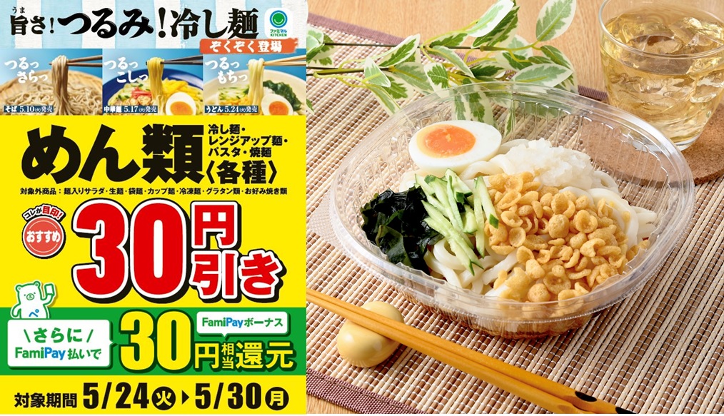 また、5月24日(火)~5月30日(月)の期間、割引キャンペーンを実施する。冷し麺、レンジアップ麺・パスタ・焼麺などのめん類各種商品が30円引きに、FamiPay払いでさらに30円相当のボーナスが還元される。ただし、麺入りサラダ・生麺・袋麺・カップ麺・冷凍麺・グラタン類・お好み焼き類などは対象外となる。