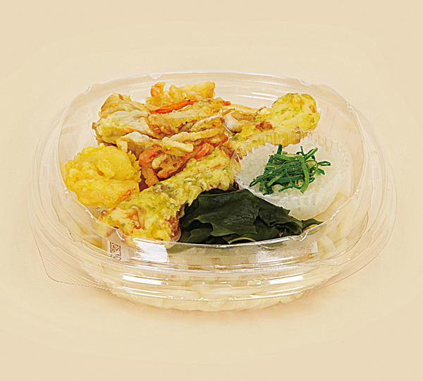 つるっと弾力のある麺にちくわ天、海老天、ごぼうかき揚げ、大根おろし、青ねぎ、わかめをのせた。風味豊かなだしつゆで食べる、食べごたえある冷しうどん。北海道・関西・中国・四国・宮崎県・鹿児島県・沖縄県を除いた地域で販売する。価格は462円。