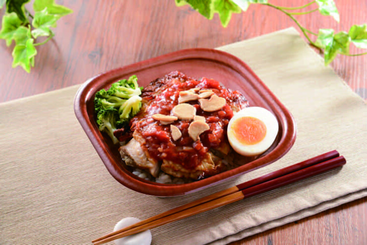 もち麦ご飯に塩こうじ・生姜・にんにくなどで漬け込んで焼き上げた鶏肉をのせ、にんにく風味のトマトソースをトッピングした。たんぱく質量は45g。