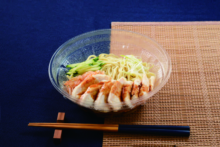 中華麺に味付けしたサラダチキン・刻みきゅうり・白髪ねぎを入れ、ゴマだれスープをかけたバンバンジー。麺は小麦粉の一部を食物繊維などに置き換えることで糖質約40%オフを実現した。たんぱく質量は29.7g、食物繊維量は24.5g。