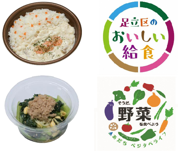 記念商品は“日本一おいしい給食”を目指す足立区の給食人気メニュー「えびクリームライス」(本体価格430円)と、野菜の積極的な摂取により疾病対策を推進する「ベジタベライフ」に関連した商品「こまツナサラダ」(本体価格240円)を発売する。地域住民の健康増進や食育につながる取り組みとして、6月の食育月間にあわせて展開する。