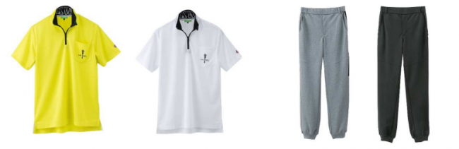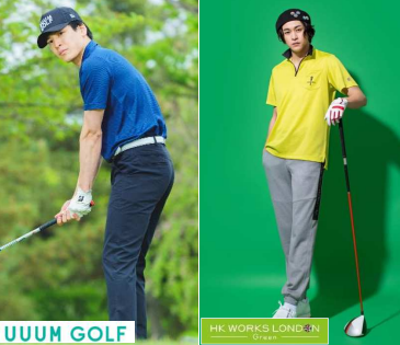 「HK WORKS LONDON Green」では「必要なのはスコアよりもお洒落!」をコンセプトに、35歳に向けて、ゴルフ場はもちろん街でも活躍するゴルフウエアを提案する。ハーフジップTシャツが1419円。ロングパンツが1969円。