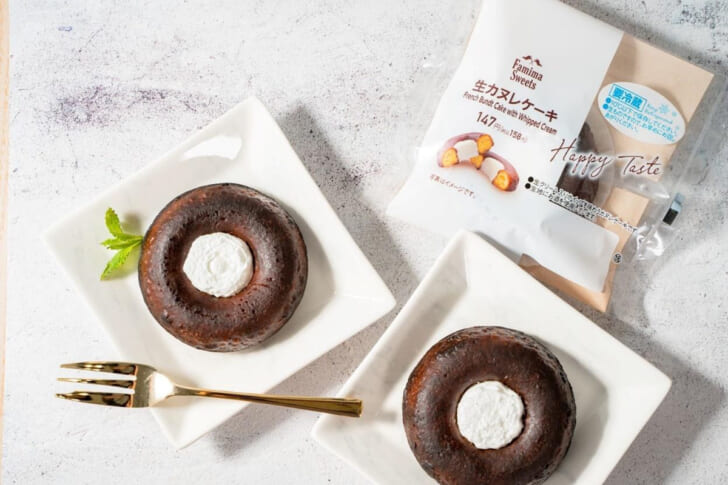 カヌレへの注目が高まるなか、ファミリーマートでもカヌレにアレンジを加えた「生カヌレケーキ」を開発した。薄力粉にフランス産の発酵バター入りのマーガリン、ラム酒、バニラオイルを配合してじっくり焼き上げた。外側はカリッとしているが、内側はもっちりしているカヌレの独特の食感を実現した。中心に絞ったホイップクリームはミルク北海道産の生クリームをブレンドした濃厚な味わいで、リッチなカヌレ生地と相性抜群だ。価格は147円(本体価格)。