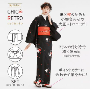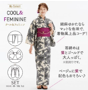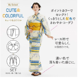 ゆかたと帯、下駄がコーディネートされたセット。おすすめコーディネートを参考に、思い思いのアレンジも楽しめる。サイズはフリー、価格は9800円。クール&フェミニン、キュート&カラフル、シック&レトロの3種類を揃える。