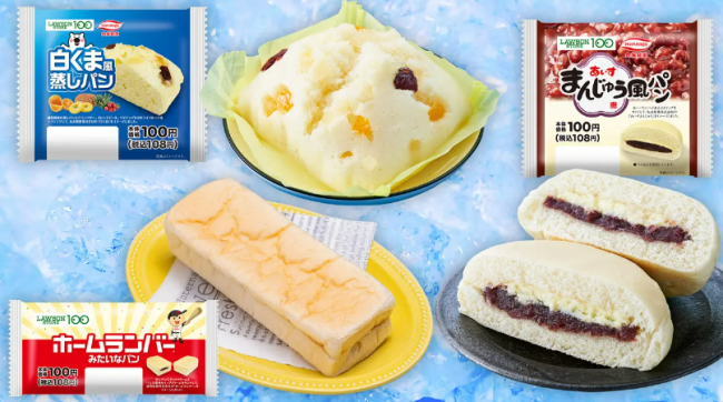 (株)ローソンストア100(東京都品川区、佐藤隆史社長)は、6月22日(水)、アイスメーカー各社とコラボレーションしてオリジナル開発した「アイスみたいなパン」3種類を全国の「ローソンストア100」で発売する。「あいすまんじゅう風パン」「白くま風蒸しパン」「ホームランバーみたいなパン」、それぞれアイスメーカー監修のもと、各モデルのアイスに近い味わいに仕上げた。価格はいずれも税込108円。