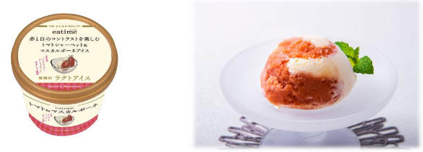 「赤と白のコントラストを楽しむトマトシャーベット&マスカルポーネチーズアイス」はeatimeのアイス初の野菜フレーバー。トマトシャーベットとマスカルポーネアイスを組み合わせた2つの味と色が味わえるアイス。トマトシャーベットには eatime「そのまま食べてもおいしいホールトマト」を使用している。味は、リストランテ・ダ・フィオーレ(東京都渋谷区)オーナーシェフ眞中秀幸氏が監修している。122mlで198 円(税別)。
